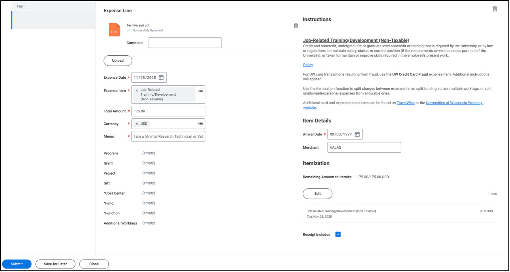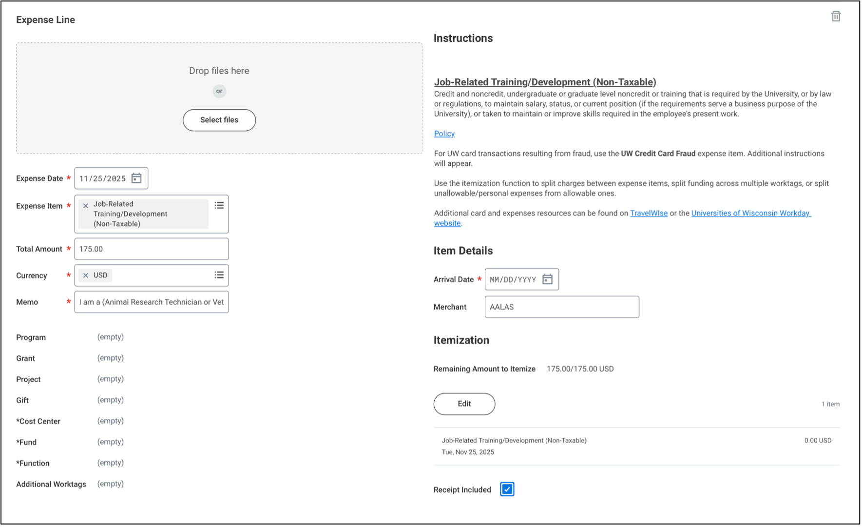 Enter the following information and add receipts by clicking on Select Files then Upload